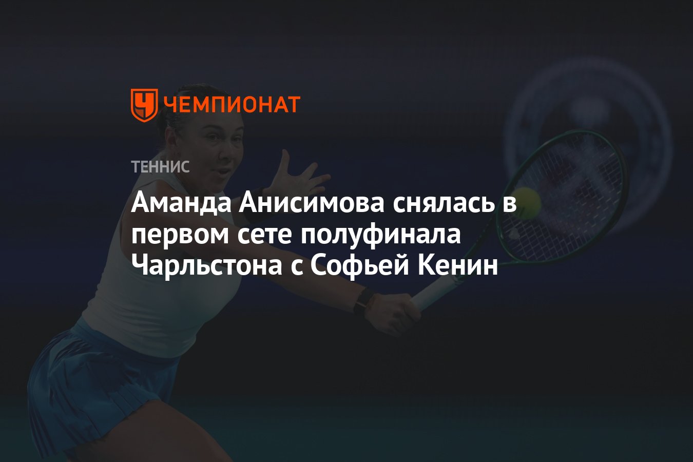 Американская теннисистка Аманда Анисимова, 16-я ракетка мира, была вынуждена сняться с полуфинального матча турнира WTA 500 в Чарльстоне (США) против соотечественницы Софии Кенин, занимающей 44-е место в рейтинге. Анисимова прекратила игру в первом сете при счете 2:5 в пользу Кенин. Матч продолжался 29 минут.