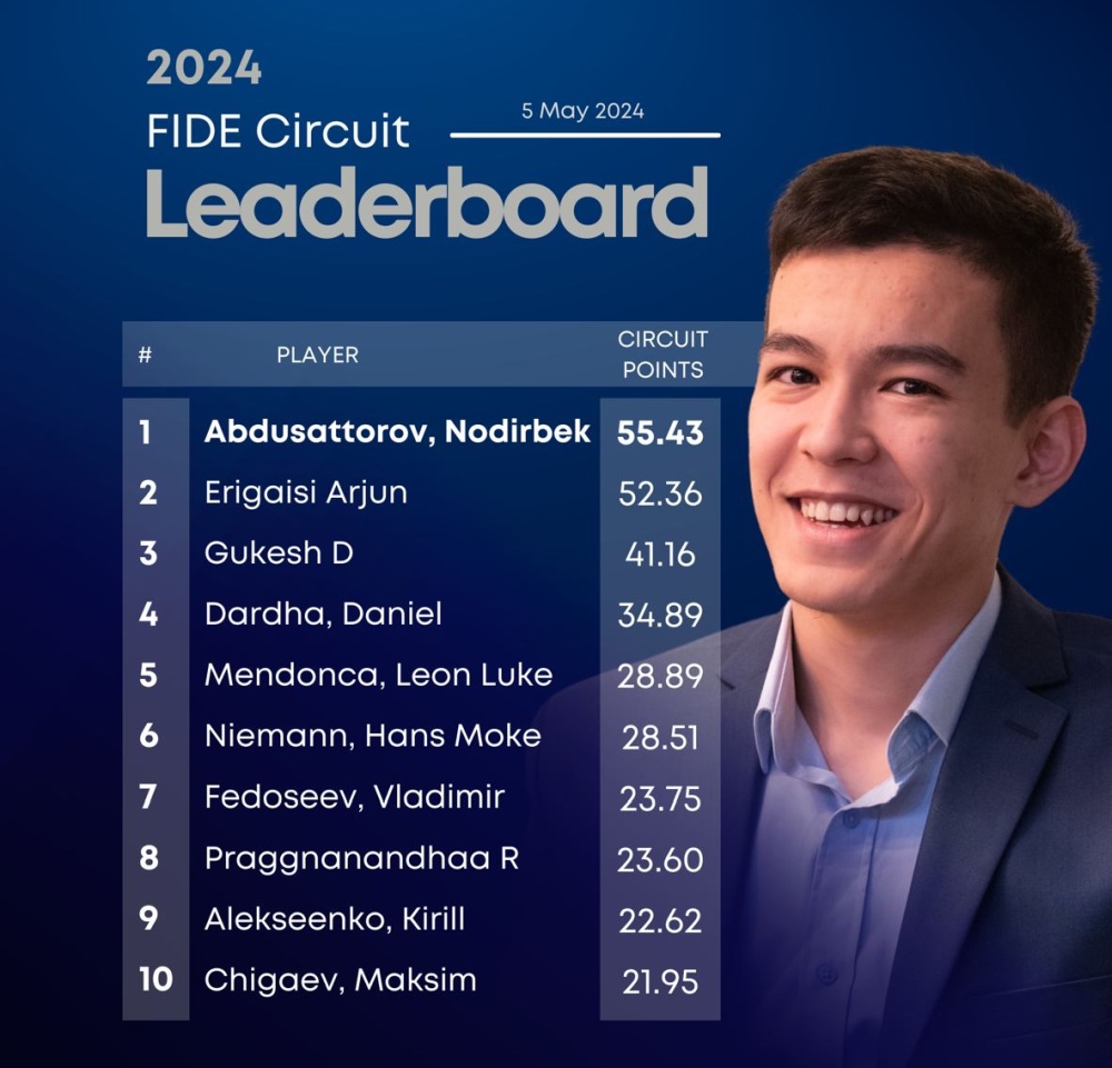 Вплотную к первой десятке находятся Нодирбек Абдусатторов и Ян Непомнящий. На данный момент у каждого из них учтен лишь один результат турнира, входящего в зачет FIDE Circuit.