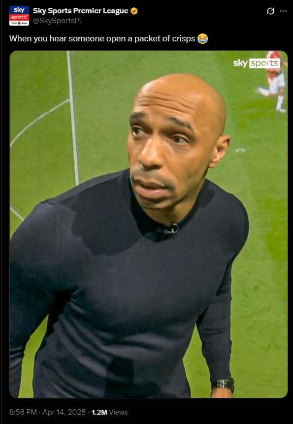 Несмотря на то, что оригинальное видео было удалено, статичное изображение Анри, имитирующего взгляд Йоро, все еще остается на странице Sky Sports Premier League X, вместе с подписью: «Когда слышишь, как кто-то открывает пачку чипсов».